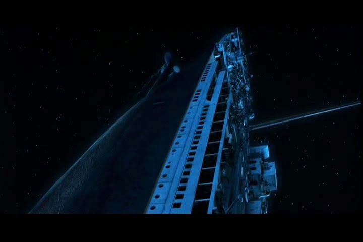 A popa, pesando vinte mil toneladas, desaba por cima de dezenas de passageiros, esmagando-os. Quando a proa submerge, arrasta a popa ainda presa pelo casco duplo da quilha, deixando-a quase na vertical; segundos depois, a proa desprende-se da popa e mergulha para as profundezas. A popa então sobe alguns metros e fica parada.